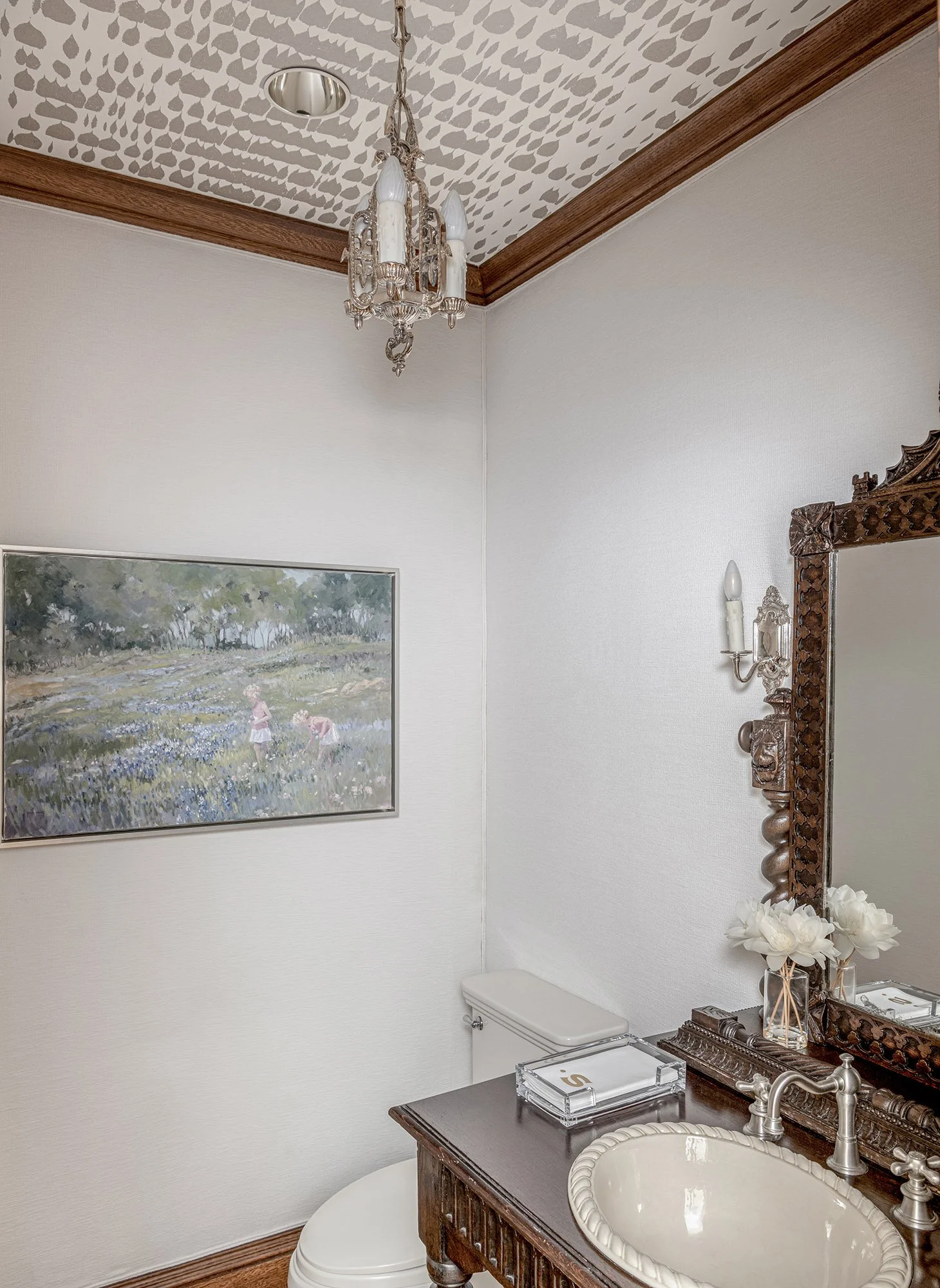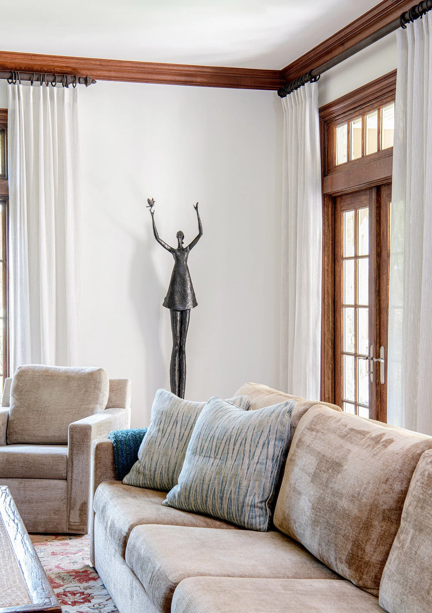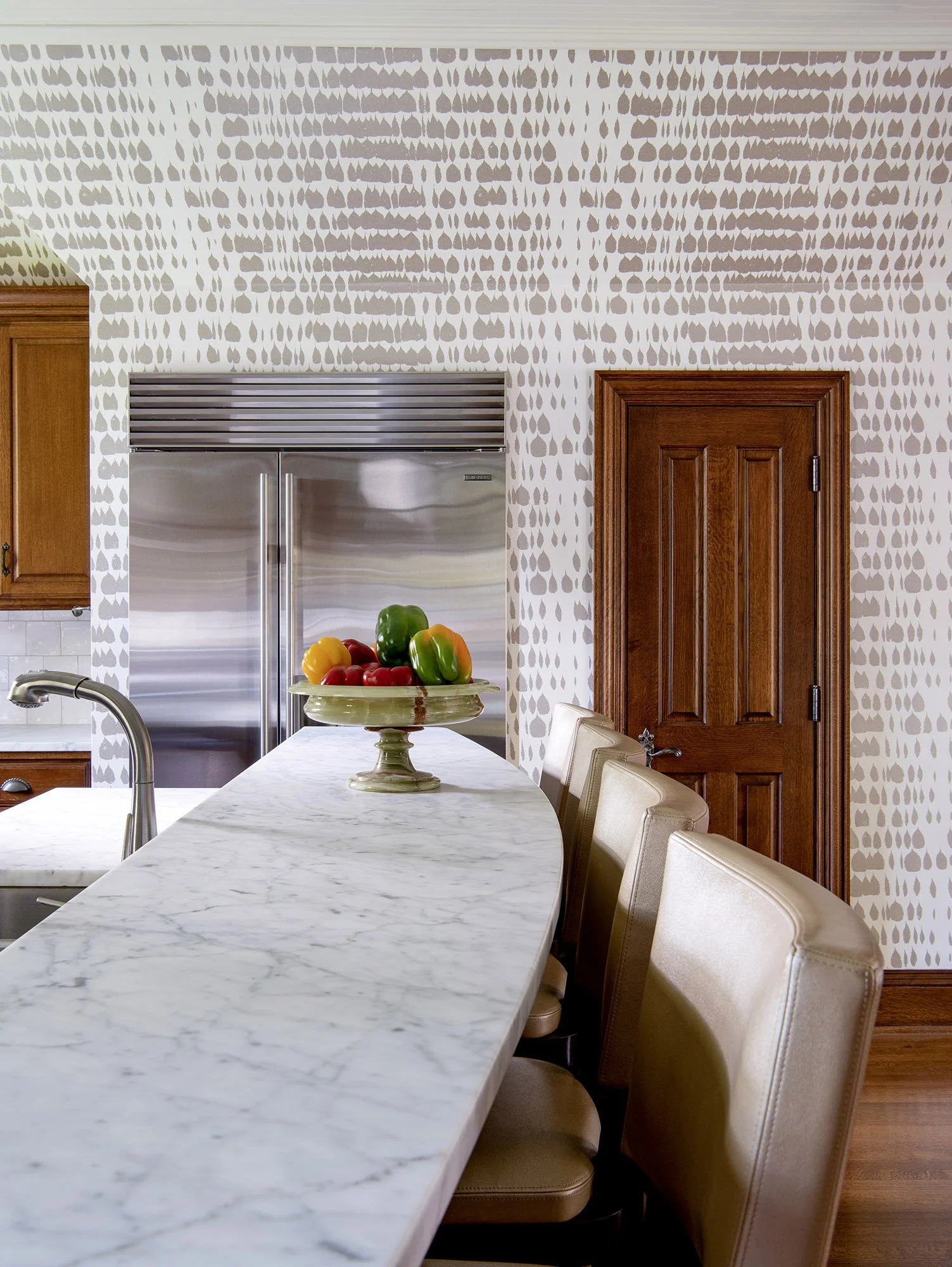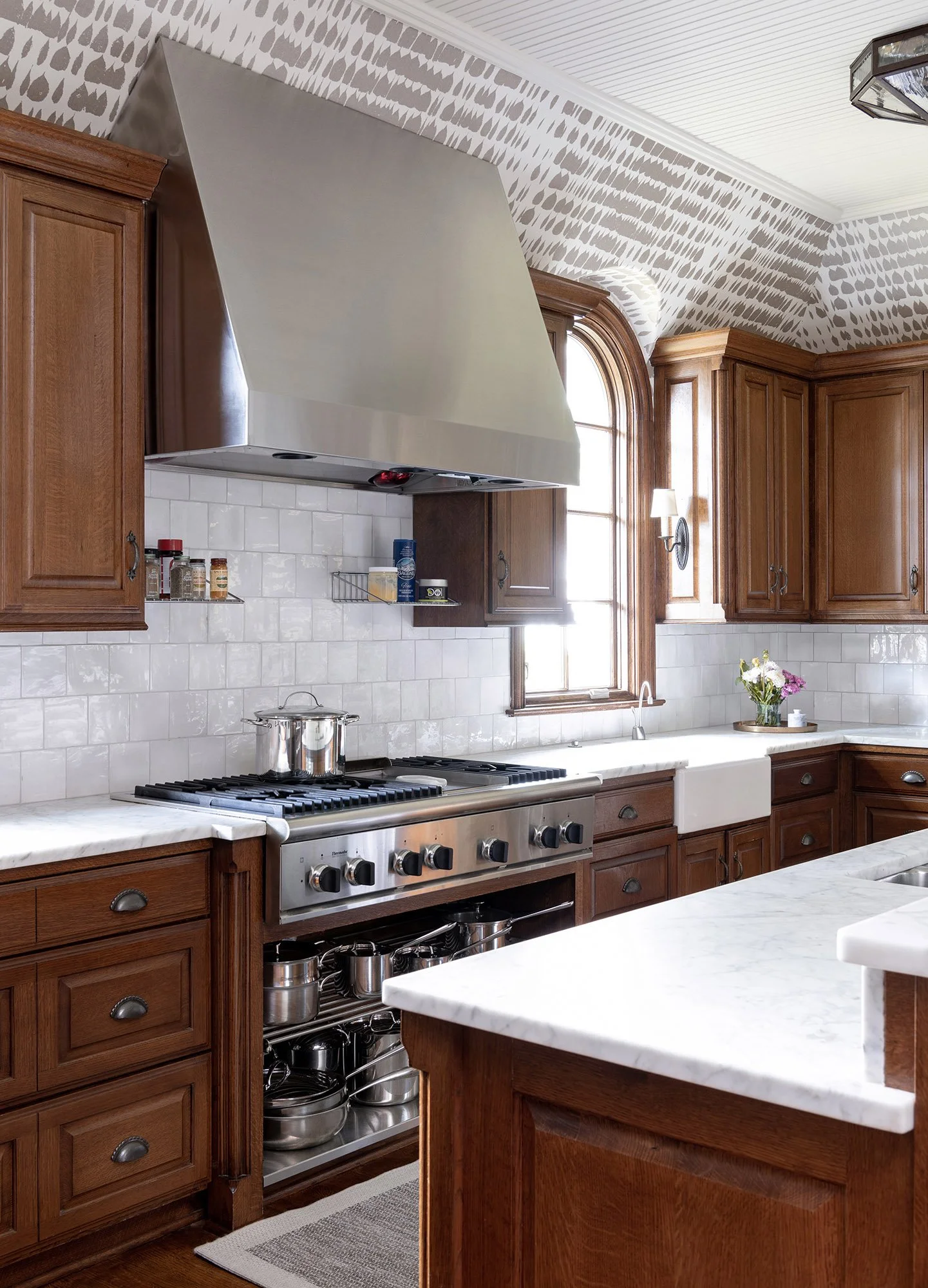A classic Tudor home is updated by combining modern furnishings with classic Tudor period details. The newly acquired art and the kitchen wallpaper add a touch of whimsey.