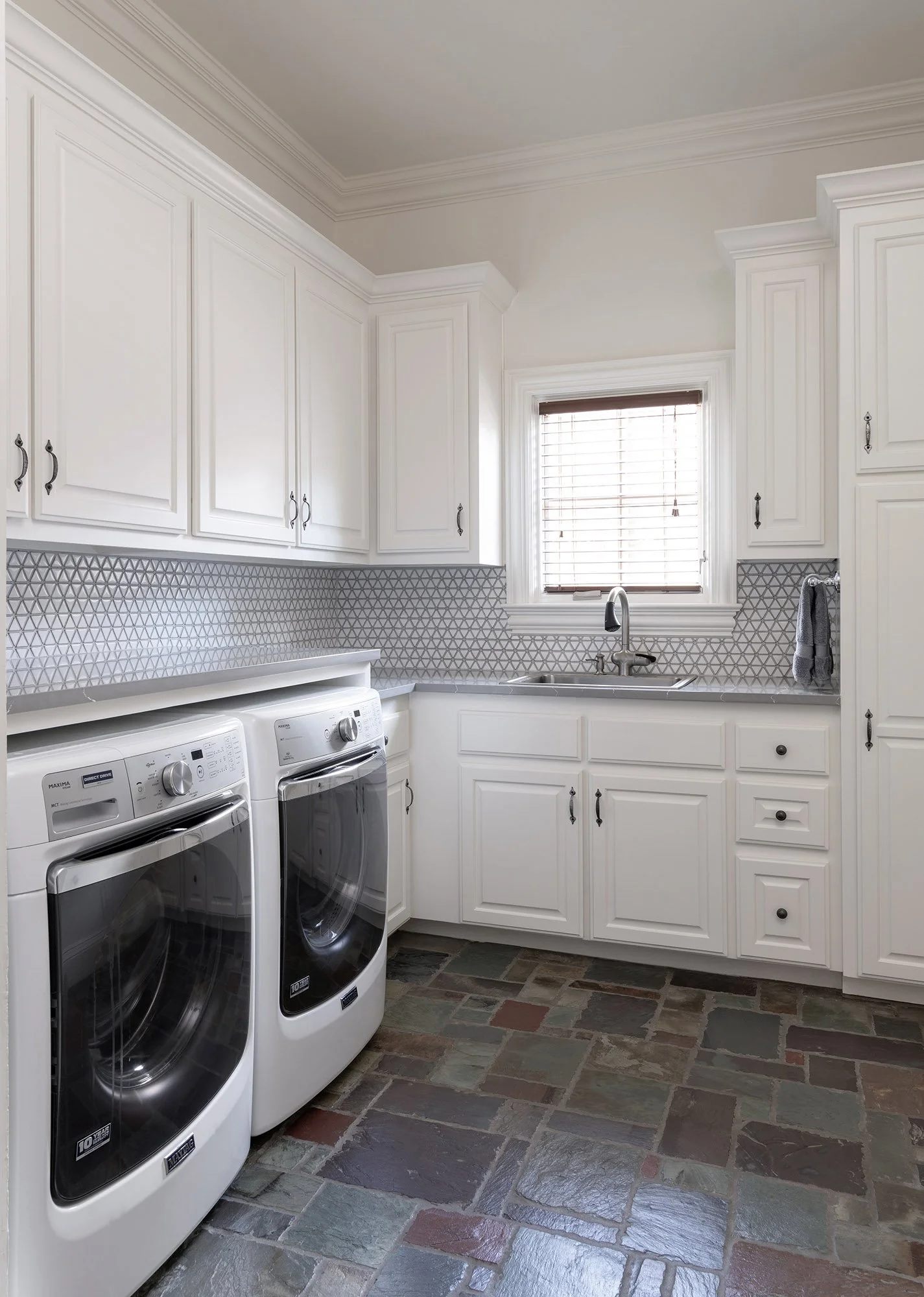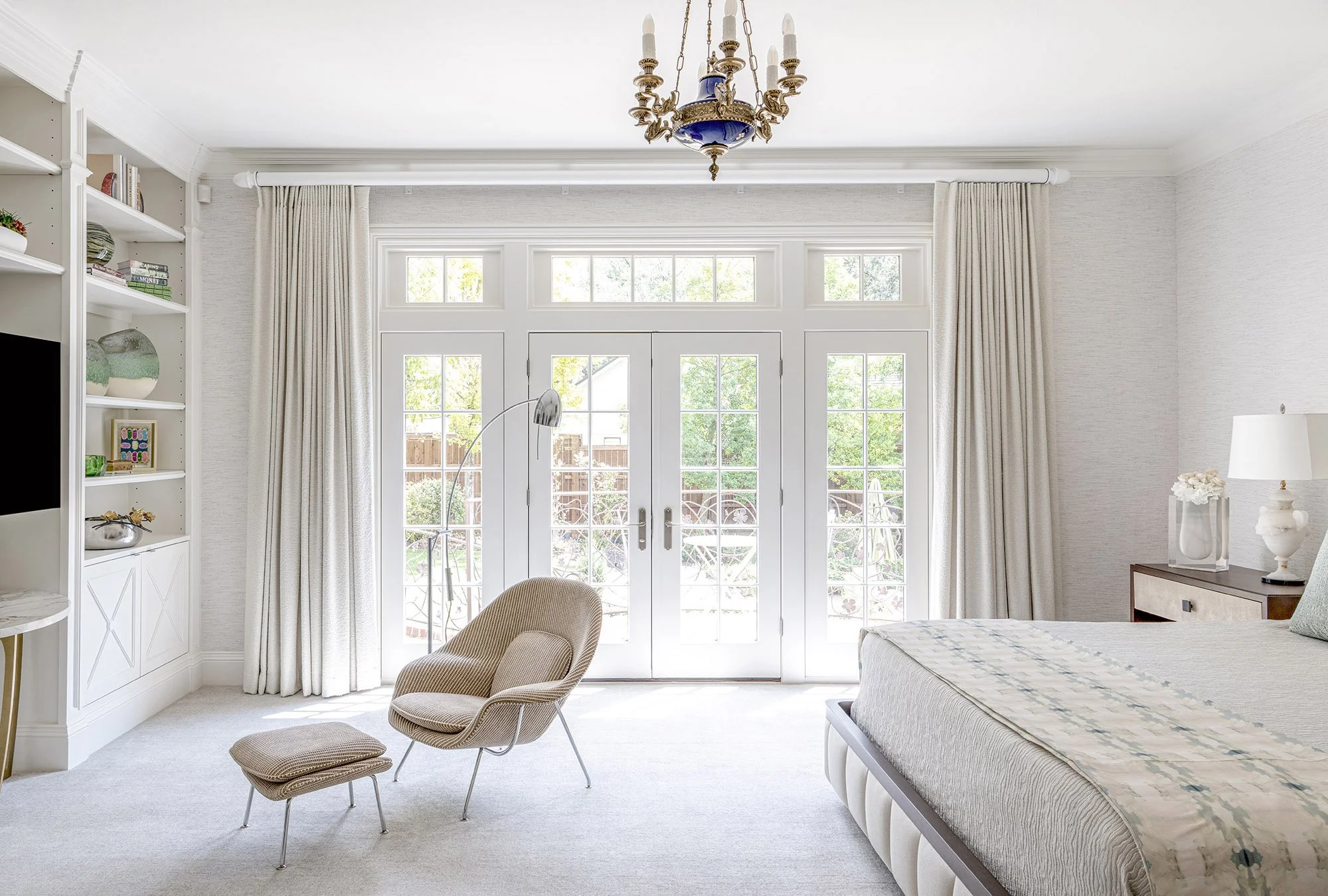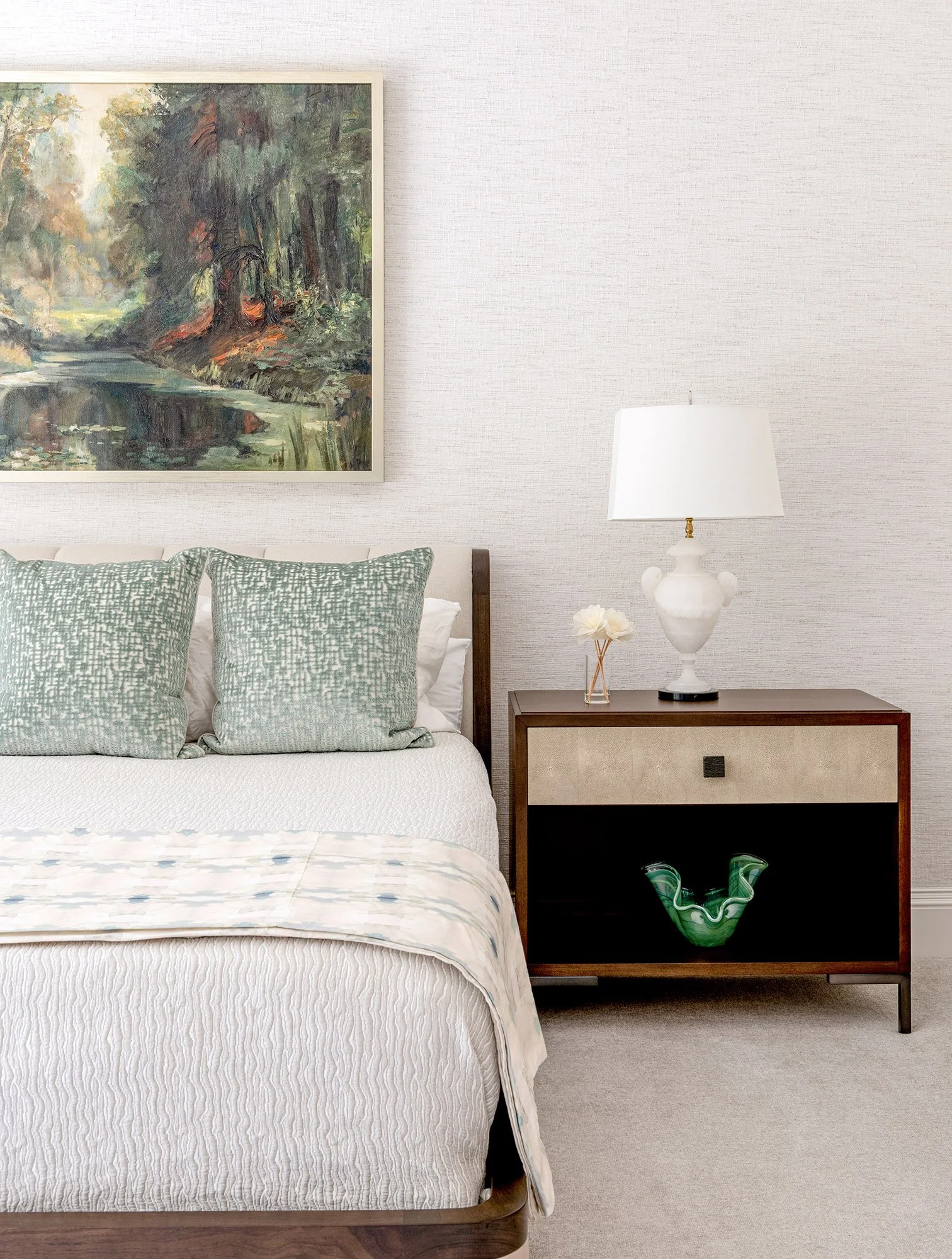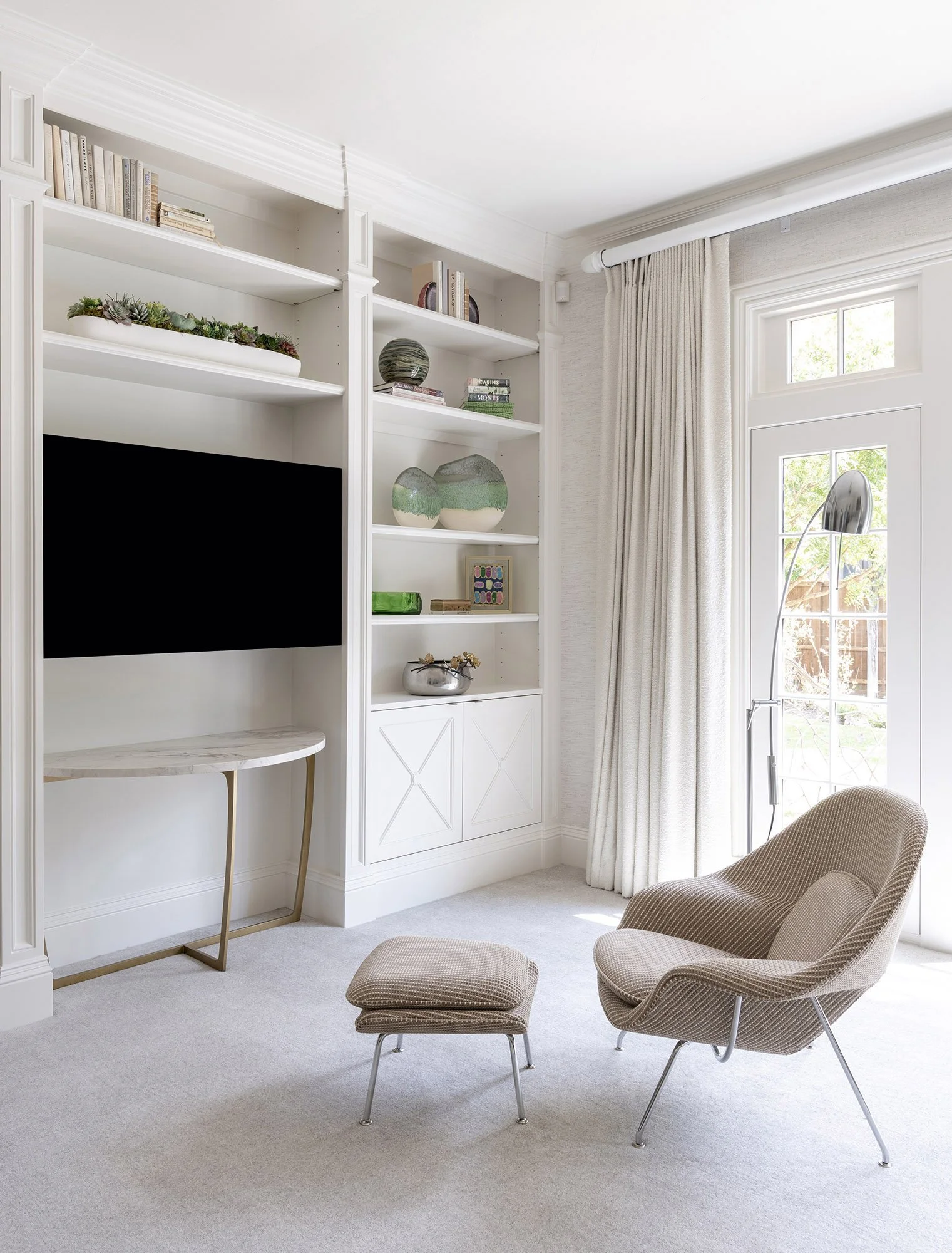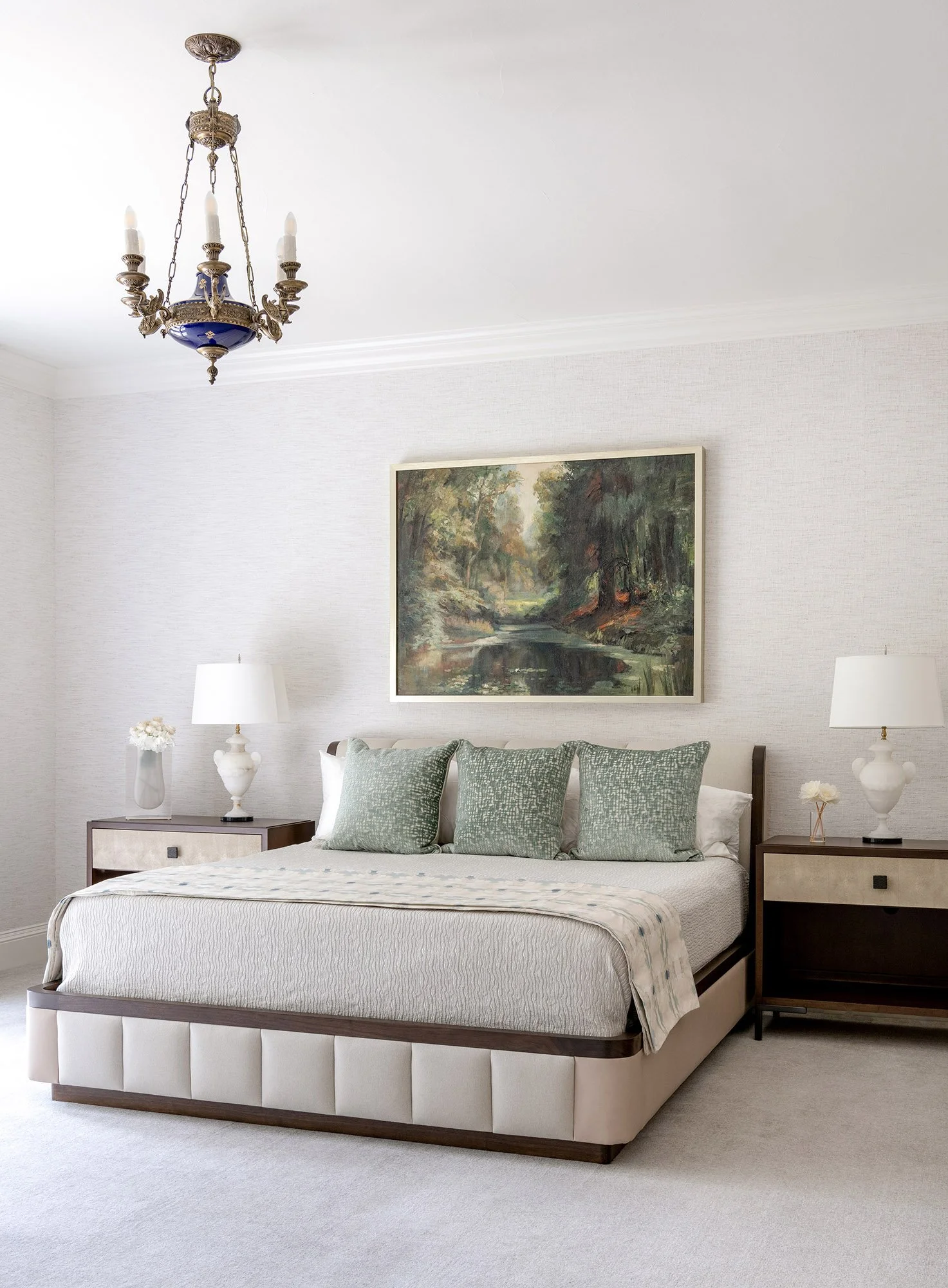 A classic Tudor home is updated by combining modern furnishings with classic Tudor period details. The newly acquired art and the kitchen wallpaper add a touch of whimsey.